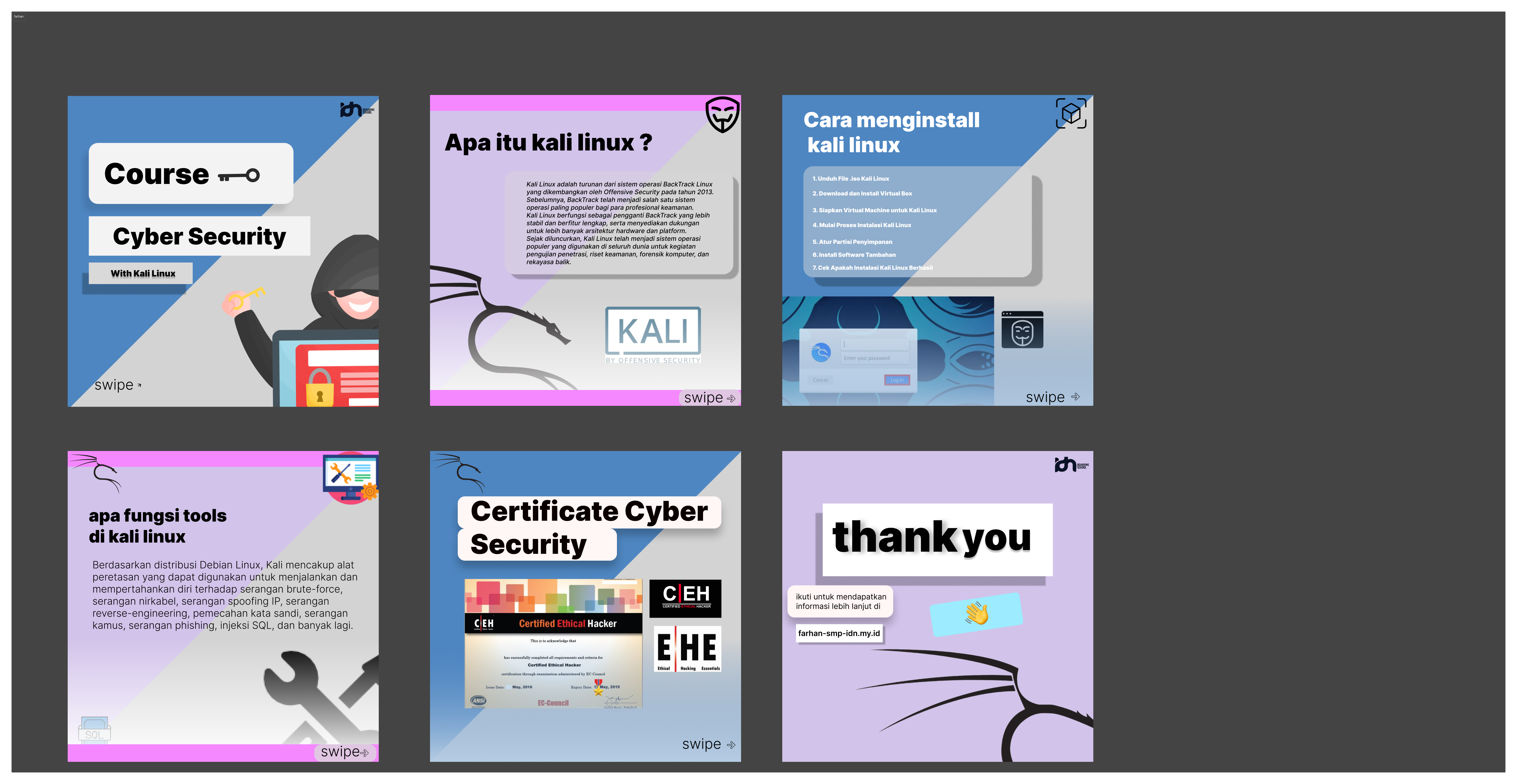 ok here I made an Instagram post poster with a cyber security theme with Kali Linux as many as 6 pages and in figma and to make this Instagram poster I had to look at a lot of references to improve the layout, and in my opinion making an Instagram post about cyber security is a bit difficult, but I made this to share knowledge about cyber security and hopefully it will be useful